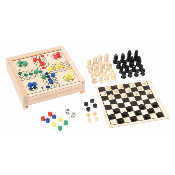 Spellendoos 3 FOR FUN met dam- en schaakspel en mens-erger-je-niet, in houten doos met schuifdeksel