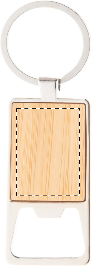 Metalen sleutelhanger met bamboe inzetstuk en flesopener.