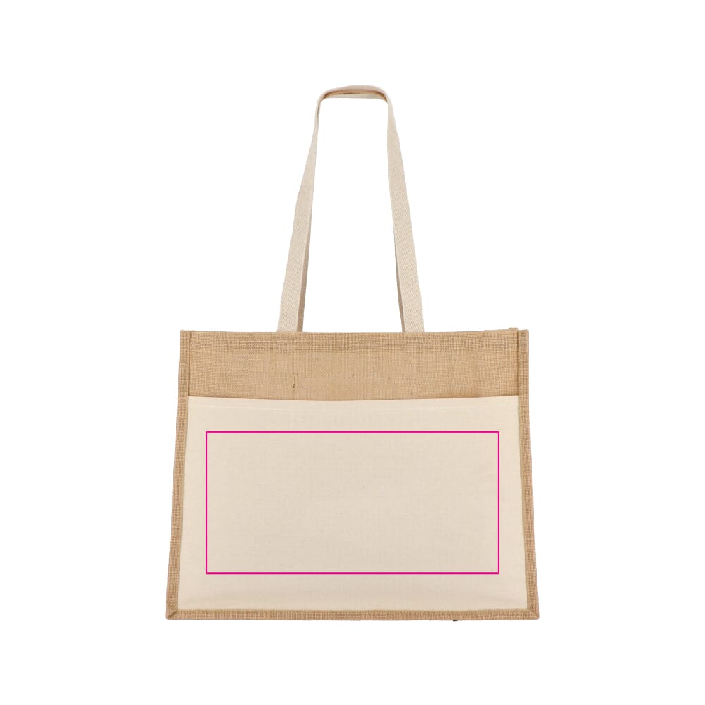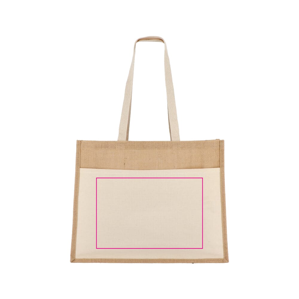 Stevige jute tas met katoenen voorvak en bijpassende katoenen handvatten. Gemaakt van 320gsm materiaal voor dagelijks gebruik. Oeko-Tex® gecertificeerd voor veilige, geteste textielmaterialen. Ideaal voor boodschappen en stranddagen.