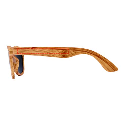 Zonnebril met retrodesign en afwerking in houtlook. Deze zonnebril met UV 400-lenzen is geclassificeerd als categorie 3, waardoor ze de perfecte keuze zijn voor bescherming tegen fel zonlicht. Voldoet aan EU-veiligheidsnorm EN12312-1. Het PC plastic zorgt ervoor dat het product licht buigbaar is voor comfort.