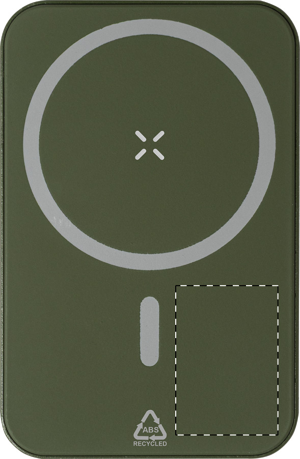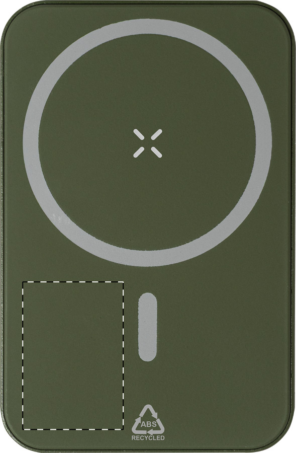 Gerecyclede ABS powerbank met 5000 mAh batterij en ingebouwde magnetische draadloze oplader (5W). Met USB-C-ingang en oplaadpoort. Inclusief zelfklevende metalen ring om de magnetische functie te gebruiken op elke draadloos oplaadbare de