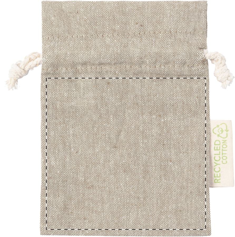 Cadeautas van gerecycled katoen met trekkoordsluiting. Met onderscheidend label van gerecycled katoen. 100% gerecycled katoen, 120 g/m².