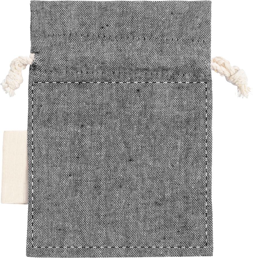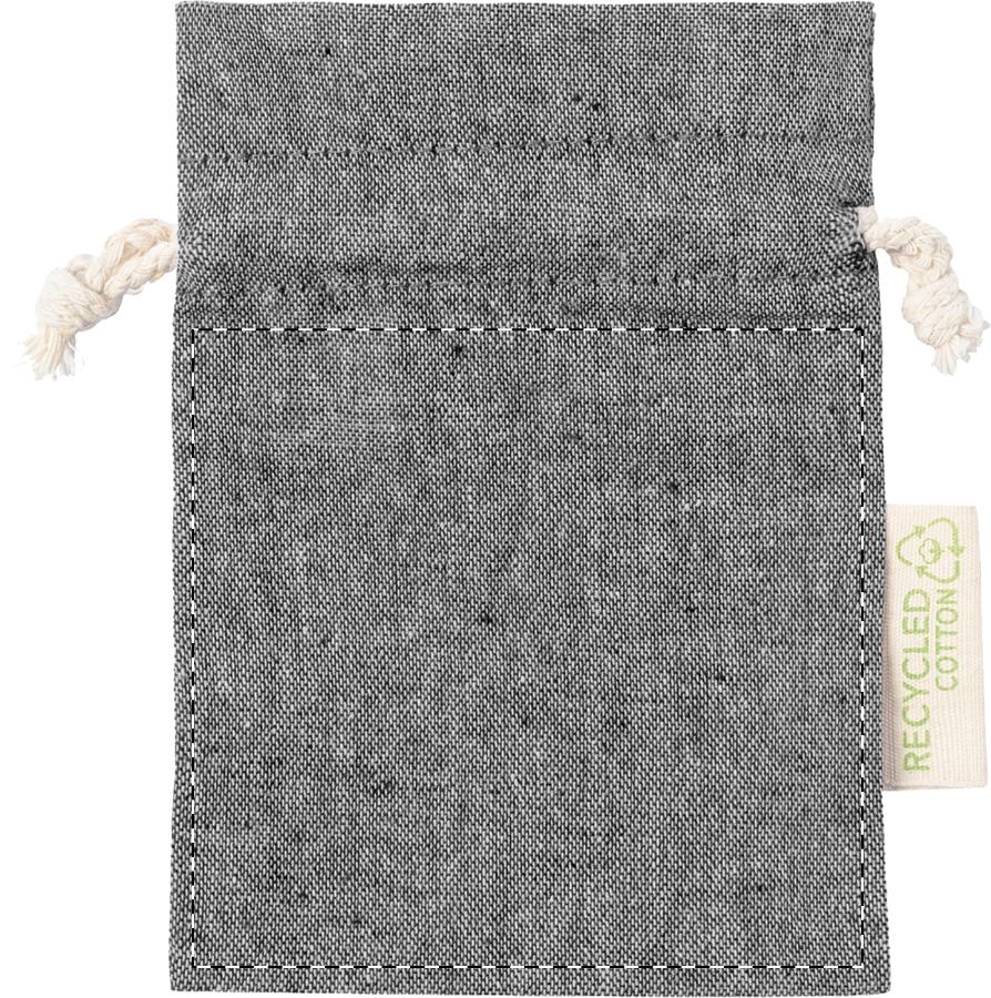 Cadeautas van gerecycled katoen met trekkoordsluiting. Met onderscheidend label van gerecycled katoen. 100% gerecycled katoen, 120 g/m².